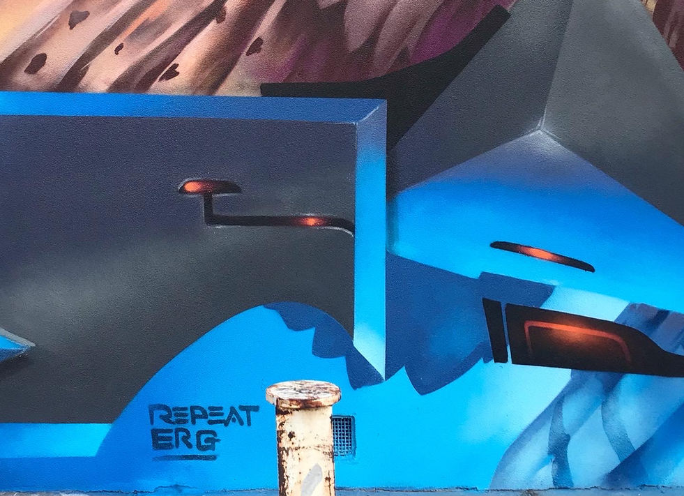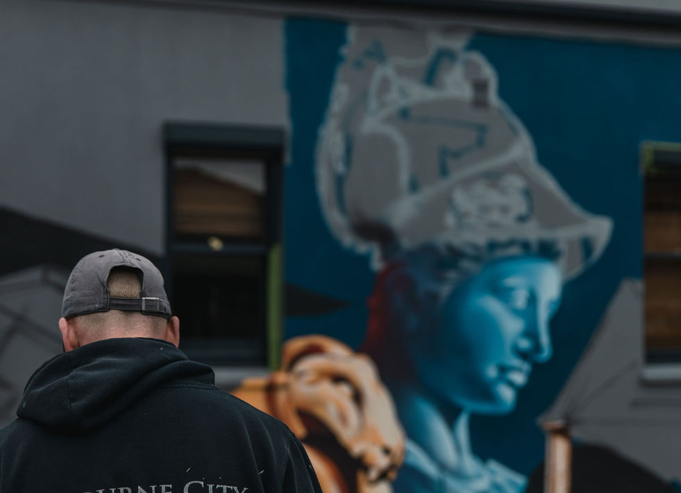 This painting is a short story about the Mythological Greek Goddess of Athena and her pet owl. Painted on the facade of this lovely home in Brunswick as a tribute to the family's Greek heritage, it also includes the serpent of time, Madusa and some futuristic letter formations. Click to the last slide in the gallery to see a 4 minute long video production, shot and produced by the amazingly talented Kelly Wang.