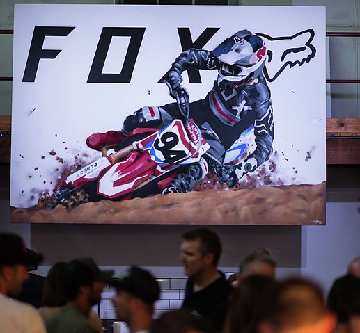 This piece was painted for a special brand launch and fundraiser event for Fox Racing and was based on their marquee rider for the 2018 season. The image was Painted on a 3m x 2m pre-built board and was hung above the main bar for the event and provided the main focal point for the guests before being auctioned off with funds going to charity.