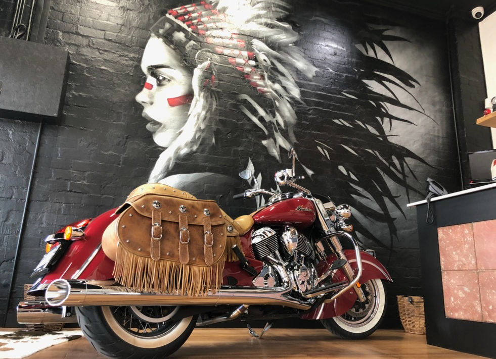 Little Chief Custom Cycles commissioned this piece by Damien in the entrance of their brand new showroom and workshop in Preston. This mural encapsulated their mascot, The Little Chief herself.